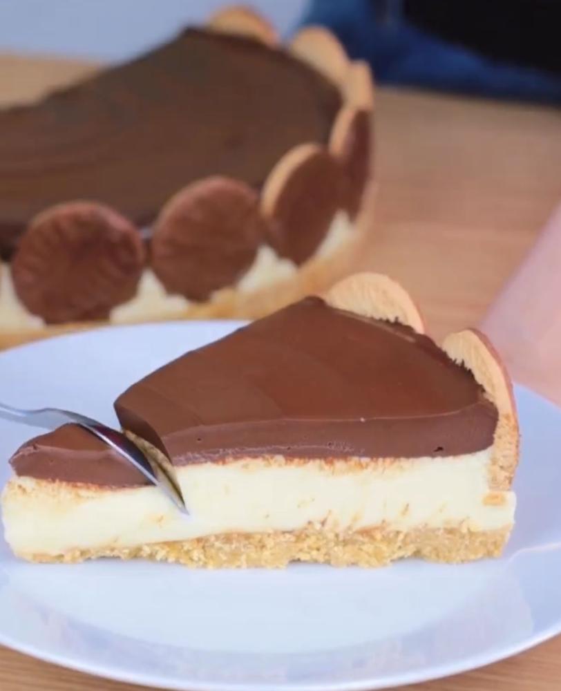 Essa torta é sensacional tem base de biscoito, recheado com um creme holandês cremoso, coberto com ganache de chocolate e decorado com bolacha calipso.